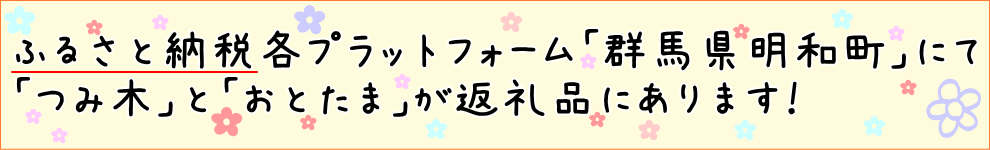 202511/18 群馬県明和町のふるさと納税にて 「つみ木」と「おとたま」の取り扱いが始まりました。 2025/10/26 11/16の東京おもちゃまつりに出展します。 2025/8/30 「つみ木のいえ」は当面の間、つみ木の製作に時間を確保するため 日曜のみの営業となります。 また、材料費高騰のため全商品新価格にて販売いたします。 どうぞよろしくお願いいたします。 2025/5/5 「つみ木のいえ」HP作成しました。 順次UPしていきます。つみ木のいえの営業日はそちらから ご確認ください。 2025/3/29 4/6イベント出展の為「つみ木のいえ」はお休みします。 2025/3/18 3/29に、「つみ木のいえ」再開します。 2025/2/14 「つみ木のいえ」3月下旬に再開予定です。 2025/1/6 「つみ木のいえ」真に不本意でありますが室外機盗難の為、 当面の間休店いたします。 店舗内で遊べる木のおもちゃ製作及び、壁面スロープトイ工事は 休店の期間中にも継続して行います。 また再開の目途が立ちましたらお知らせいたします。 2024/11/21 「つみ木のいえ」公式LINEはじめました。 お得なクーポンなど配布中です。 2024/11/14 17日は「つみ木のいえ」プレオープン お得にご入場できます! 2024/11/9 「つみ木のいえ」オンライン予約始まりました! 2024/11/6 クラウドファンディングにご支援いただきありがとうございました。 2024/9/1 2024/11/23に「つみ木のいえ」OPEN予定です。 OPENにあたり9/2より 上毛新聞社「ハレブタイ」にてクラウドファンディングを行います。 2024/5/2 5/19の東京おもちゃまつりに出展します。 2023/12/10 上毛新聞ツイン版「JOMOtto じょもっと」にてご紹介いただきました 2023/11/12 送料を改定いたしました。 2023/3/29 東京おもちゃまつり2023 5月20日・21日の両日出展します。 2022/12/26 12/29~1/4までお休みとなります。 2022/8/18 ご注文時の決済方法を変更しました。 2021/12/26 12/29~1/4までお休みとなります。 2021/11/22 2021/1/1より「おとたま」の価格を税込1320円となります。 また、「おおきなおとたま」「ちいさなおとたま」「おとたま 限定カラー」も 同時発売いたします。 2021/10/24 ホームぺージリニューアルしました。